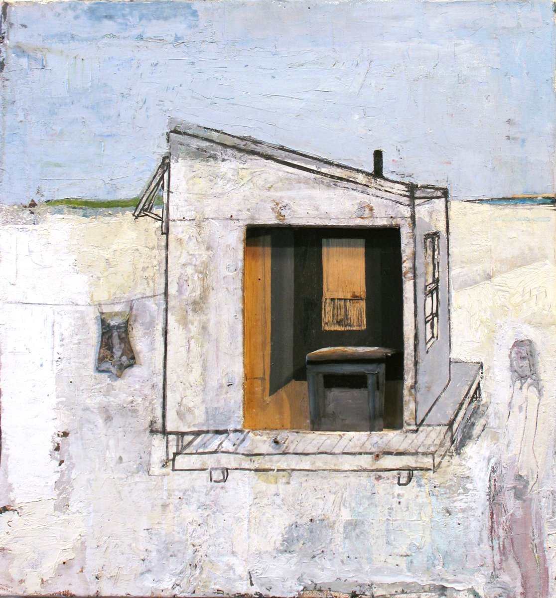2019, oil on cavas, wood, wax, paper, wire, glass, 20x24x4"