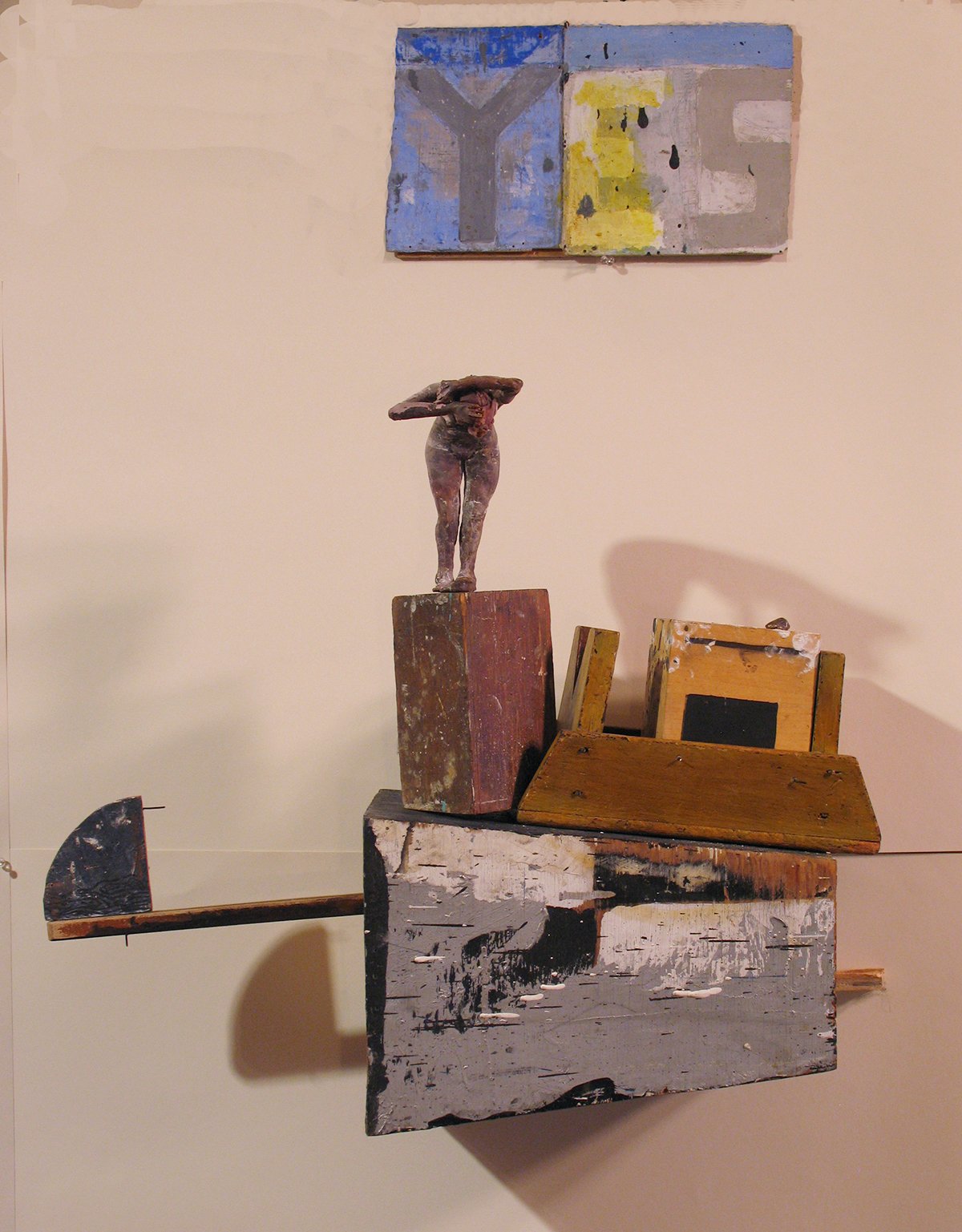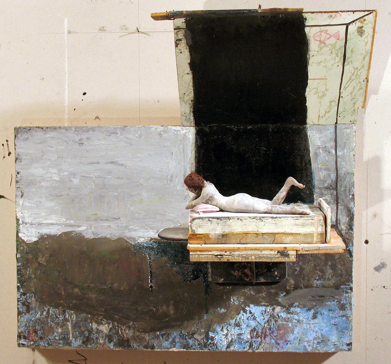 , side view, 2019, Wax, wire, oil on wood, 16x22x9"