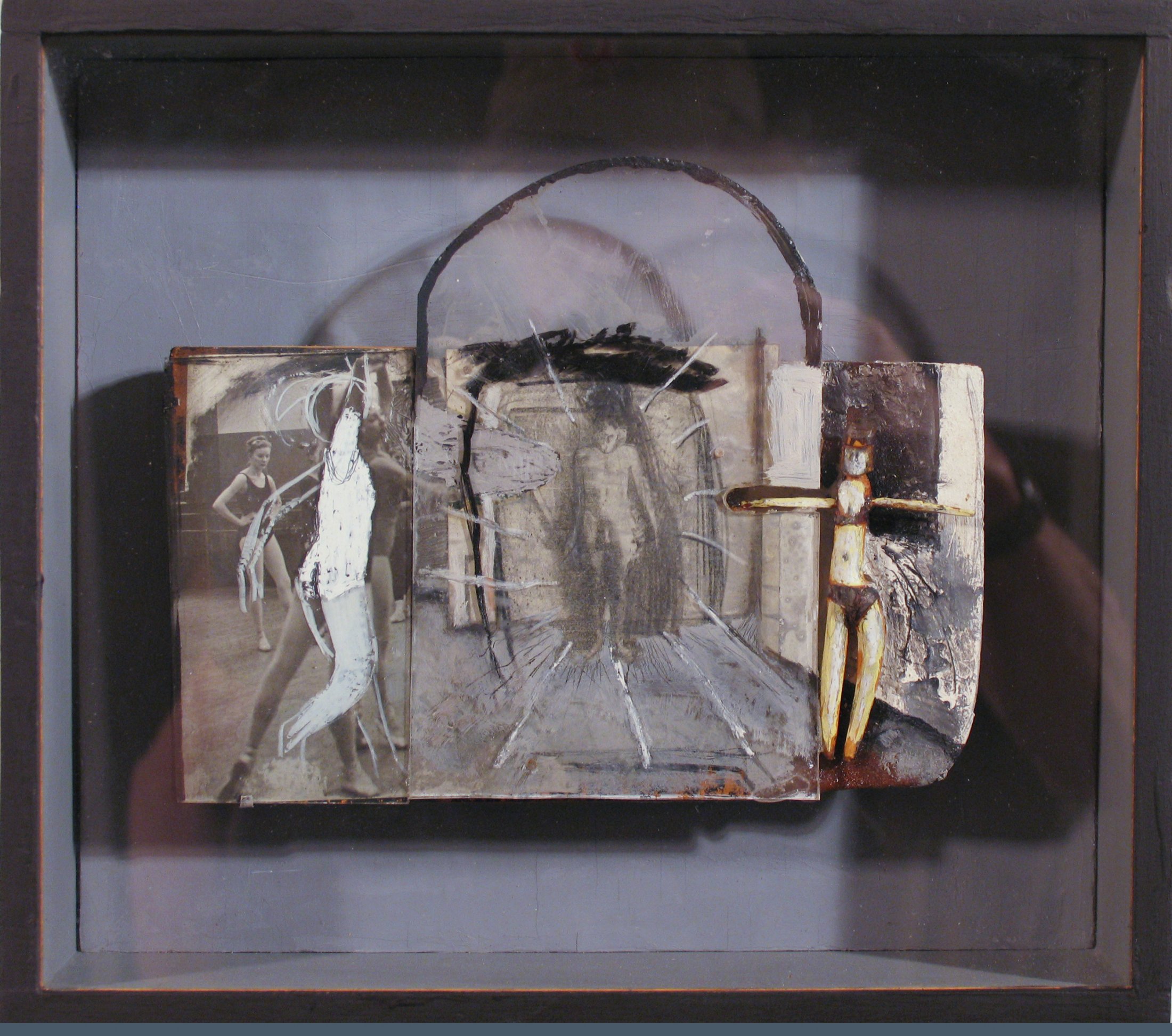 , 2019, oil on canvas, wood, digital print, glass, wire, 14x18x4"